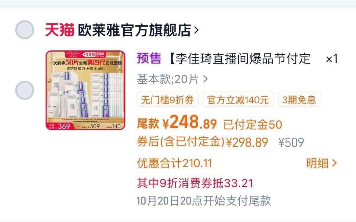 10月21日,有网友在网上吐槽:“从来没见过尾款钱还变的,直播间券也领了,9折也选了,事实就是涨价了。”这位网友原本准备购买一款预售的欧莱雅面膜,支付定金50元后显示尾款为248.89元。后来却发现尾款变成了282.1元。因为尾款价格出现变化,网友没有支付,退款后,发现买两箱价格较为便宜,便重新下单。