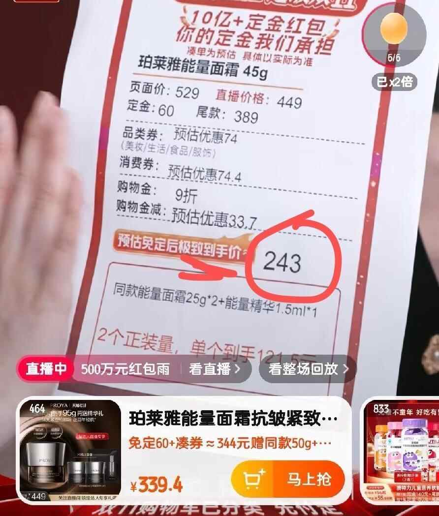 还有网友吐槽,达人直播间宣传的价格跟自己付款的价格相差太大。这位网友分享,在直播间里,主播把面霜和精华的价格特意打印出来,扣除品类券、消费券、购物金等一系列优惠后,精华的“预免定估极致到手价”为250元,面霜为243元。