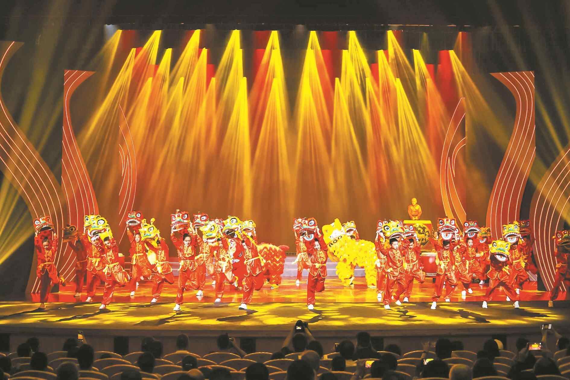 演出开场,安志顺打击乐团激昂的鼓点瞬间点燃全场氛围。被誉为“世界狮王”的国家级非遗项目——深圳黄连胜醒狮团,携手深圳市宝安区下十围小学少儿醒狮团同台献艺,为整场晚会写下震撼开篇。