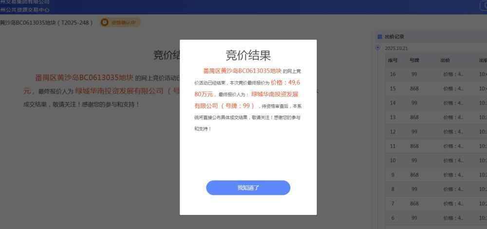 10月21日,广州番禺区黄沙岛BC0613035地块,历经16轮竞价,最终被绿城以总价49680万元拿下,折合楼面价25936元/平方米,溢价18%。