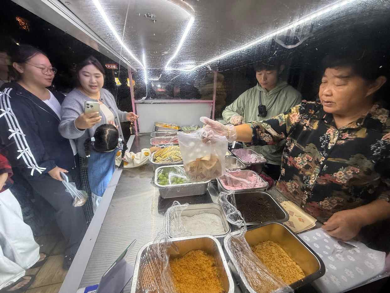 当晚不时飘下零星雨点,有排队客人撑着伞。记者和食客交谈中了解到,他们中不少是附近的居民或学生,有一些是回头客。一对食客顺着摊主社交媒体专程找过来探摊品尝,路上用时约半小时,他们经常去不同的小吃街找美食,之前还去过江夏夜市、财大小吃街、湖经夜市等。“口感软糯,水果汁水很足。”一名正在路边吃这家麻糍的汉口学院大四学生告诉记者,他的麻糍馅料加了蓝莓和杨枝甘露。