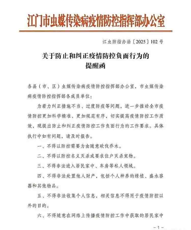 疫情防控进入关键阶段,江门市近期发布《关于防止和纠正疫情防控负面行为的提醒函》(江虫防指办函〔2025〕102号),以22个“不”的明确禁令划定防疫工作红线。据记者采访及相关信息梳理,这22条规定本质上是一份内部规范流程,核心针对基层工作人员及参与防控的组织方,通过明确操作注意事项,确保防控工作既符合群众利益,又遵循规范流程,推动疫情防控更加科学有序,助力早日实现全面清零目标。