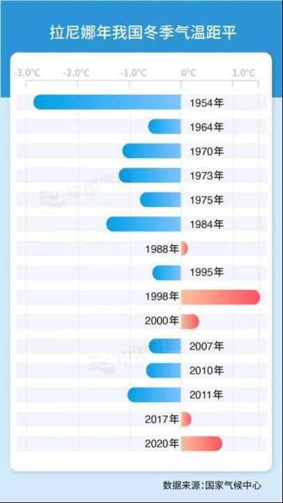 以2020-2021年冬季为例。当时,我国也经历了一次中等强度的拉尼娜事件,而且多地还遭遇了冷到破纪录的极端天气。但那个冬季结束后,数据分析显示确为暖冬。