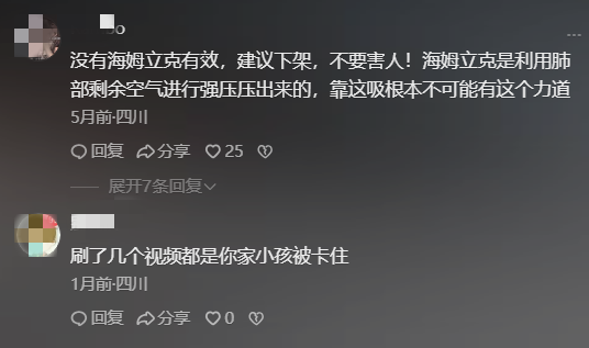 有网友质疑:“这东西真的有用吗?”更多留言揭开了真相,“演的,上两个视频刚刷到,也是这个家,也卡住了……怎么就你家的孩子天天被卡?”“没有海姆立克有效,建议下架,不要害人!海姆立克是利用肺部剩余空气进行强压压出来的,靠这吸根本不可能有这个力道,刷了几个视频都是你家小孩被卡住。”