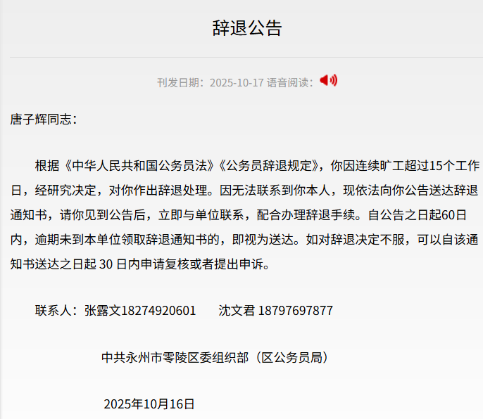 公告显示,该区公务员唐某某因连续旷工超过15个工作日,被依法予以辞退。由于无法联系到本人,采取公告形式送达辞退通知书。自公告之日起60日内,逾期未到单位领取辞退通知书的,即视为送达。如对辞退决定不服,可以自该通知书送达之日起30日内申请复核或者提出申诉。