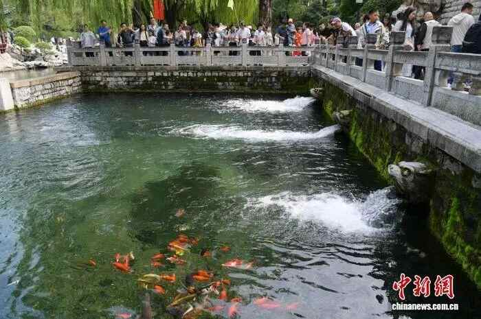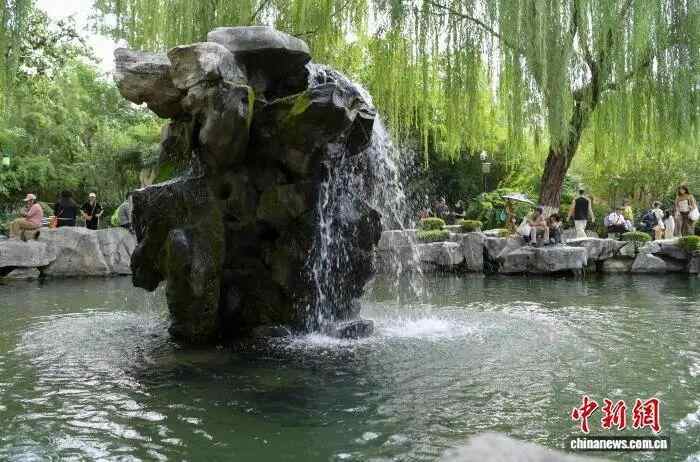 图为游客在济南五龙潭景区的月牙泉景点观赏“月牙飞瀑”美景。中新社记者 张勇 摄