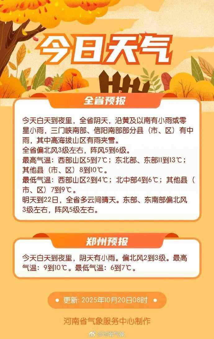 根据河南气象部门的监测,今天河南省沿黄及以南地区仍有弱降水,其中三门峡、洛阳、信阳南部等地的部分县市还会有中雨,高海拔山区也可能出现雨夹雪。最低气温仅有2℃,棉袄要穿起来了。