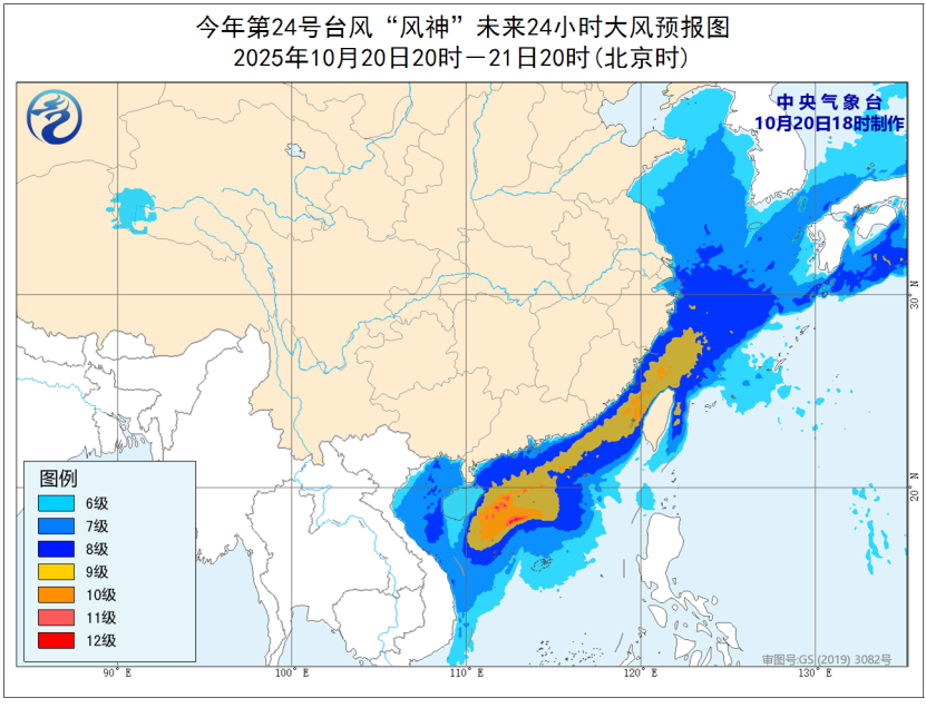 中央气象台预计,受冷空气和“风神”的共同影响,20日20时至21日20时,台湾海峡、台湾以东洋面、巴士海峡、南海北部和中部、东沙群岛、西沙群岛及中沙群岛附近海域、北部湾、琼州海峡、东海、黄海、渤海海峡以及山东半岛沿海、江苏沿海、上海沿海、长江口区、杭州湾、浙江沿海、台湾沿海、福建沿海、广东沿海、广西沿海、海南岛沿海将有6-8级大风,阵风9-10级,其中东海西南部、台湾海峡、台湾以东洋面、浙江南部沿海、福建沿海、广东东部沿海、南海北部和中西部的部分海域或地区的风力有9-10级,阵风11-12级,台风中心经过的附近海域风力可达11-12级,阵风13-14级。