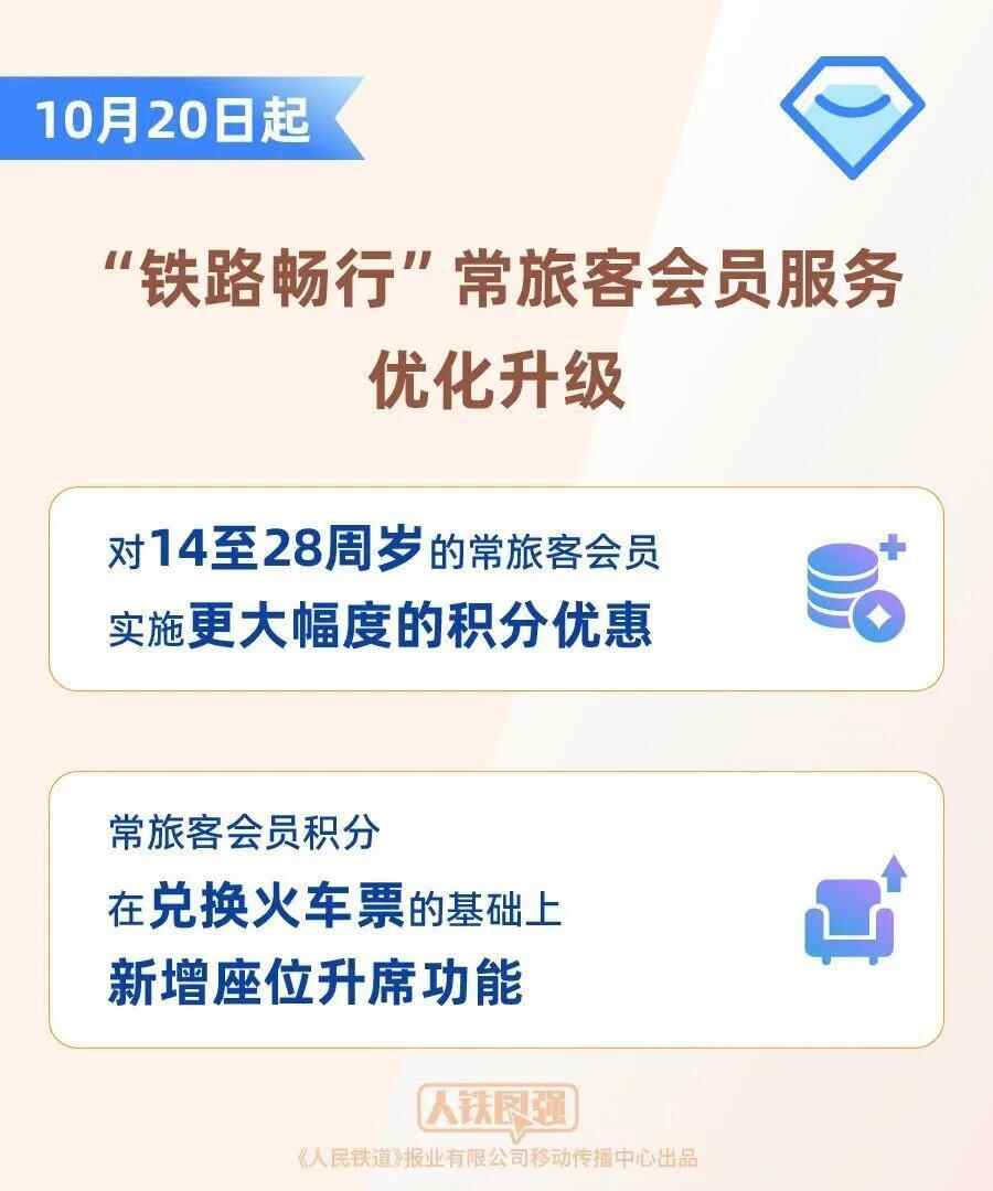 10月20日起,中国国家铁路集团有限公司将优化升级“铁路畅行”常旅客会员服务,对14至28周岁持居民身份证、港澳台居民居住证、港澳居民来往内地通行证、台湾居民来往大陆通行证、外国人永久居留身份证的常旅客会员实施更大幅度的积分优惠,会员积分在兑换火车票的基础上,新增座位升席功能,常旅客会员积分的应用场景进一步拓展,旅客将获得更多实惠,有利于激发“铁路+”消费潜力,促进人员流动和沿线经济发展,为全面扩大内需注入新动能。