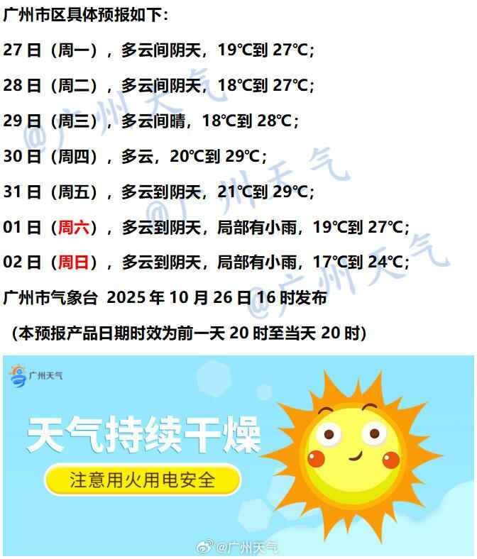 27-28日,南部沿海市县多云间阴天,局部有零星小雨,其余市县多云间晴天。最低气温:粤北市县16~18℃,南部沿海市县21~23℃,其余市县18~20℃。