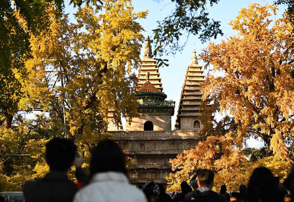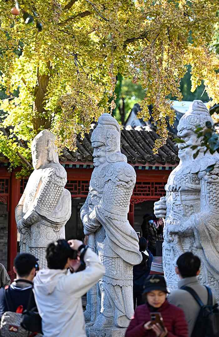 秋冬之交的北京石刻艺术博物馆(也称五塔寺)内,银杏等大面积泛黄,石刻文物掩映在绚烂的色彩中,吸引不少游客前往观赏。新华社记者 陈钟昊 摄