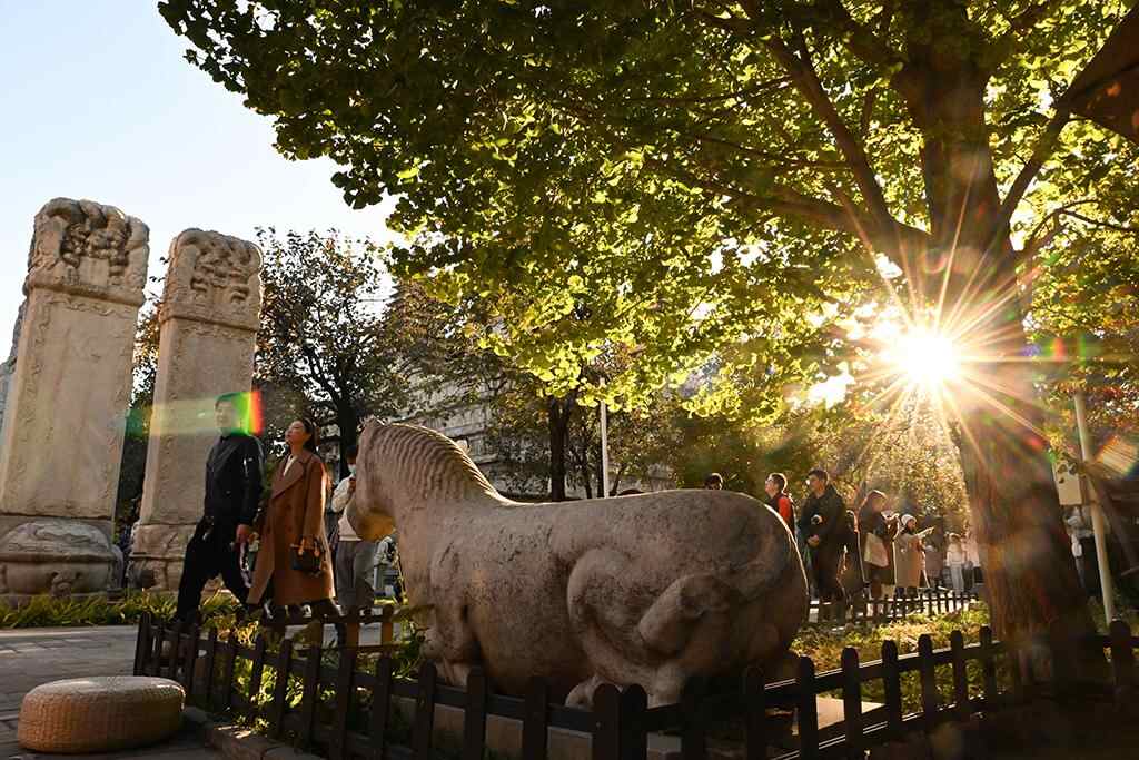 10月26日,游客在北京石刻艺术博物馆拍照留影。