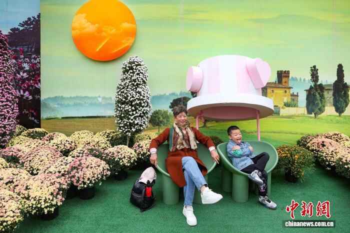 10月26日,南京农业大学湖熟菊花基地内,市民与孩子在展示的菊花景观前留影。中新社记者 泱波 摄