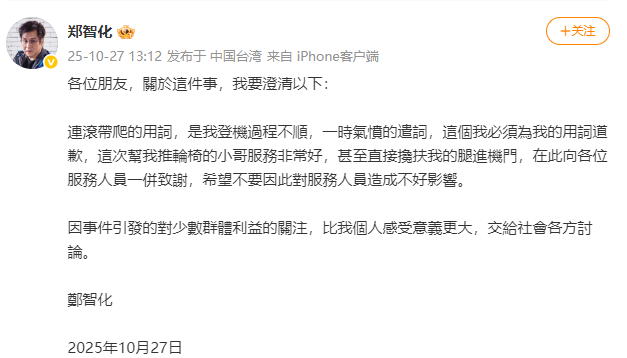 10月27日,歌手郑智化发文道歉。全文如下↓