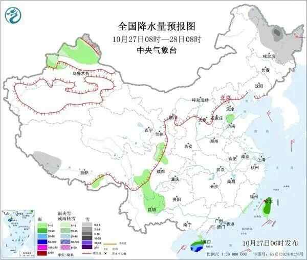 中央气象台预计,今天,新疆北疆北部、黑龙江中东部、西藏西南部等地部分地区有小雪或雨夹雪,其中,黑龙江北部等地部分地区有中到大雪。海南岛、台湾岛大部等地部分地区有中到大雨,其中,海南岛南部等地部分地区有暴雨。