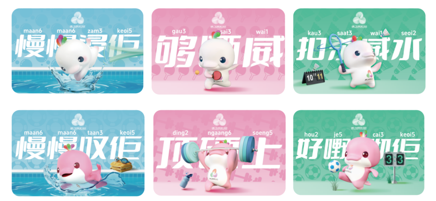 据介绍,首款主题卡设计以十五运会核心视觉元素为主体,吉祥物跃动卡面,背面融合粤港澳三地地标,展现湾区文化共融特色。其余6款设计则将比赛项目与岭南文化巧妙结合,用粤语流行语为比赛项目加油,传递全运拼搏精神,吉祥物运动形态憨态可掬,极具纪念价值与传播趣味性。