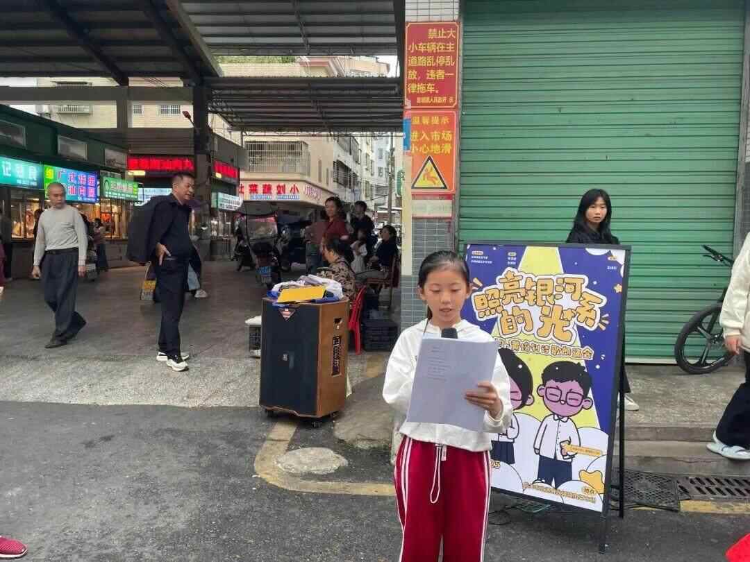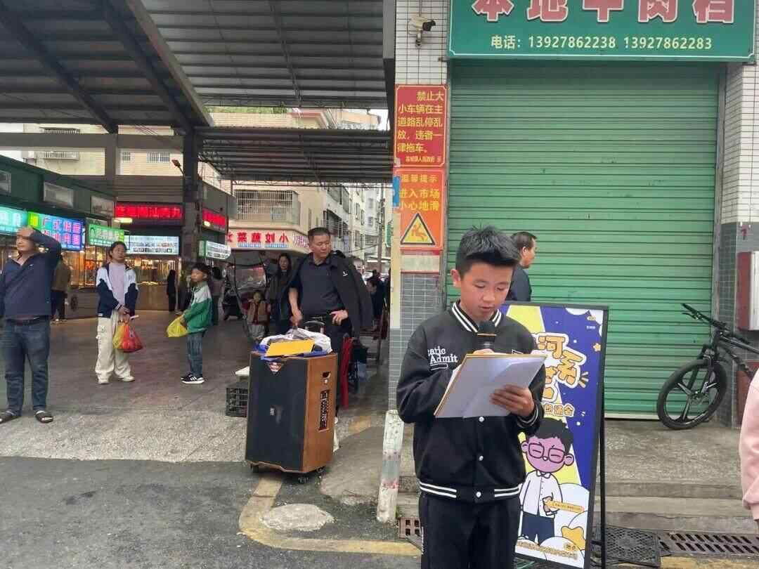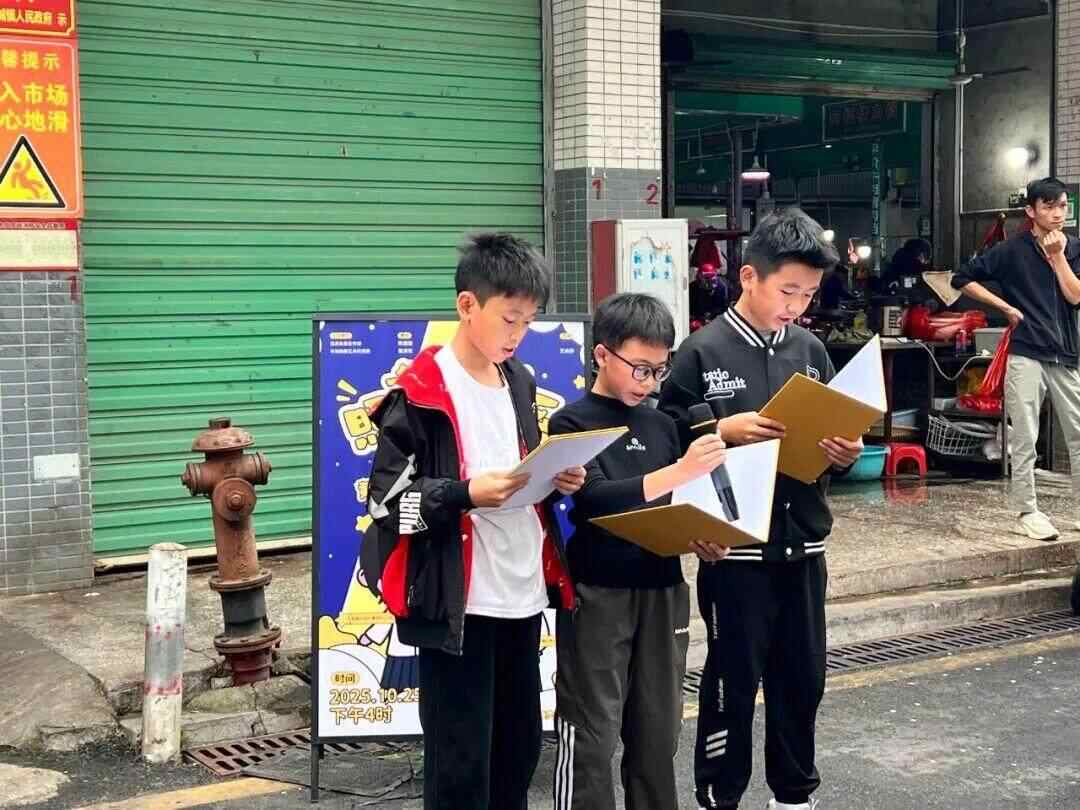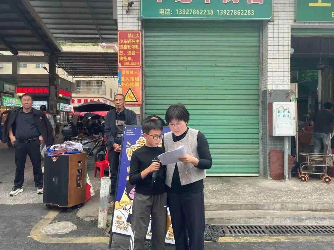 活动现场温情涌动,传钧和培钊的亲友团们都前来助力。奶奶带着朋友们,用淳朴的客家话朗诵《轻与重》《秋》,熟悉的乡音让现场洋溢着亲切的氛围。随后,姐弟俩与妈妈共同朗诵了《最贵的季节》《追问月亮》,母子三人的声音在市场中交织,构成了一幅温馨的画面。