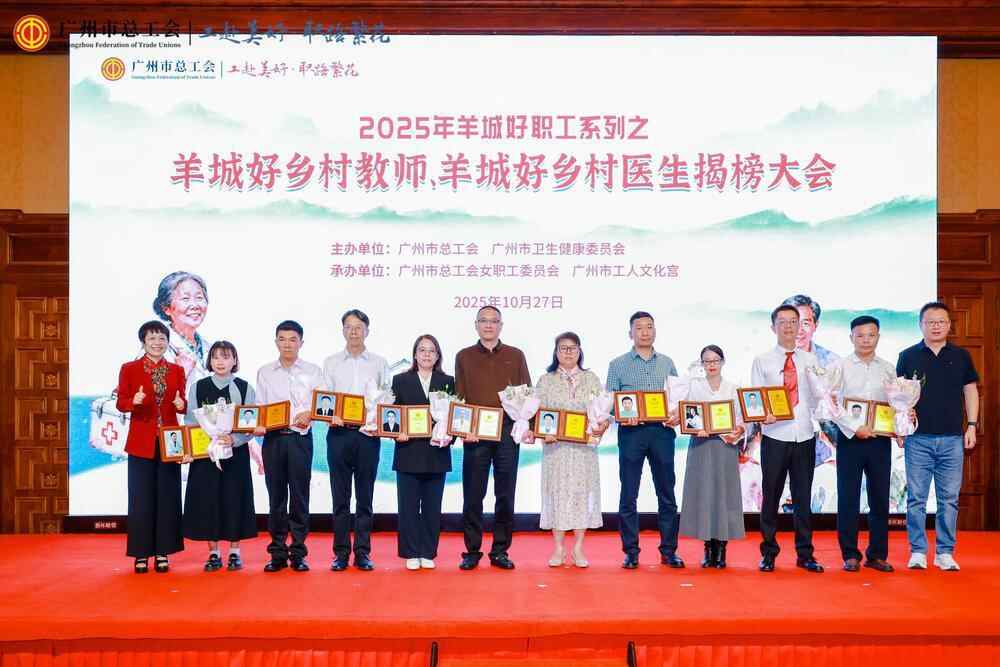 10月27日,由广州市总工会与广州市卫生健康委员会主办的2025年羊城好职工系列之羊城好乡村教师、羊城好乡村医生揭榜大会暨疗休养活动启动仪式圆满收官。100名坚守广州乡村教育讲台与医疗卫生一线的工作者,共同见证了荣誉时刻。