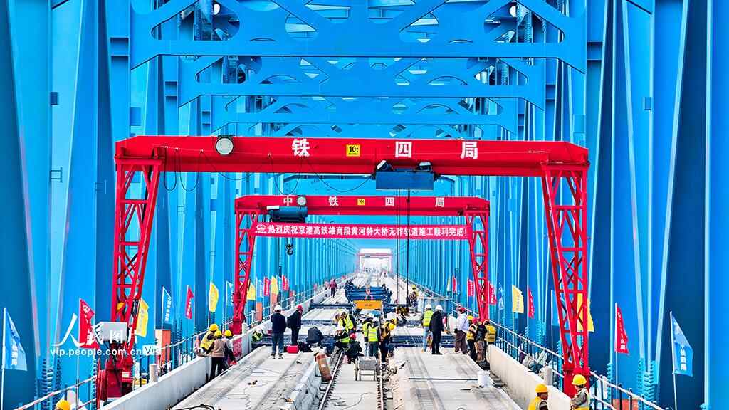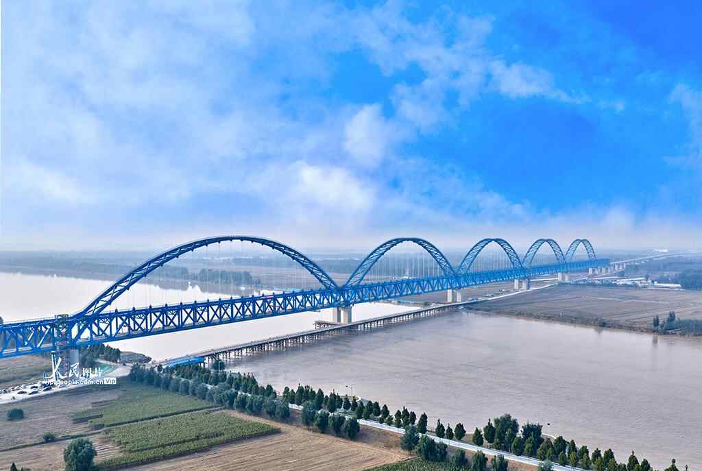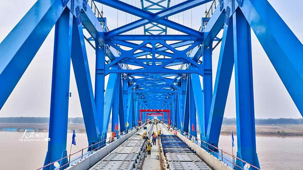 京港高铁雄商段黄河特大桥位于山东省梁山县与河南省台前县交界处,是全线控制性工程。主桥全长1600米,总用钢量约4.3万吨,采用“一联九跨”连续钢桁梁结构,具有“长联、大跨、高速、无砟”的技术特点,在高速铁路无砟轨道桥梁施工领域达到行业领先水平。史家民摄(人民图片网)