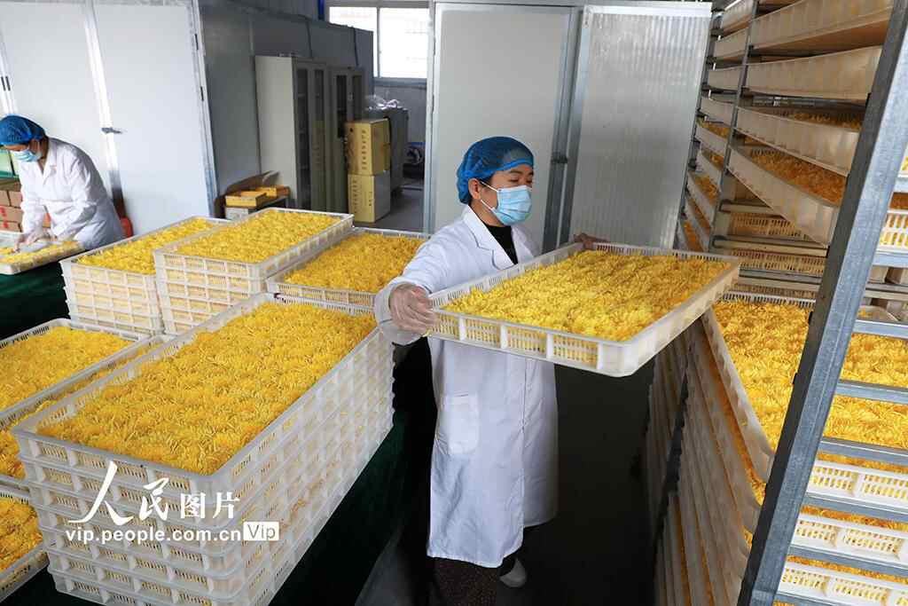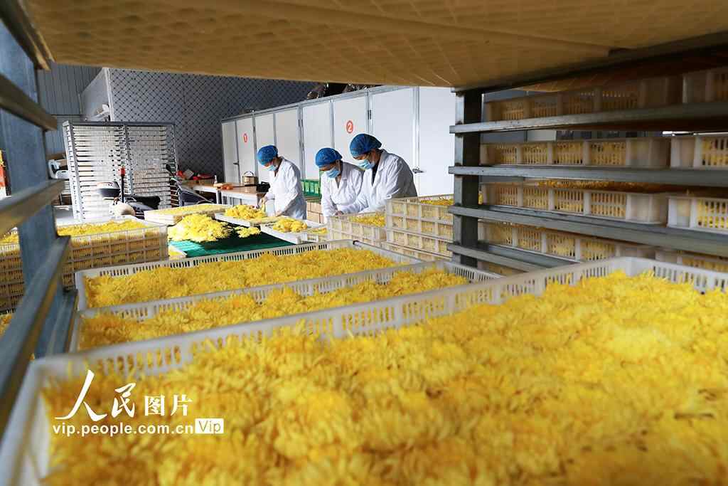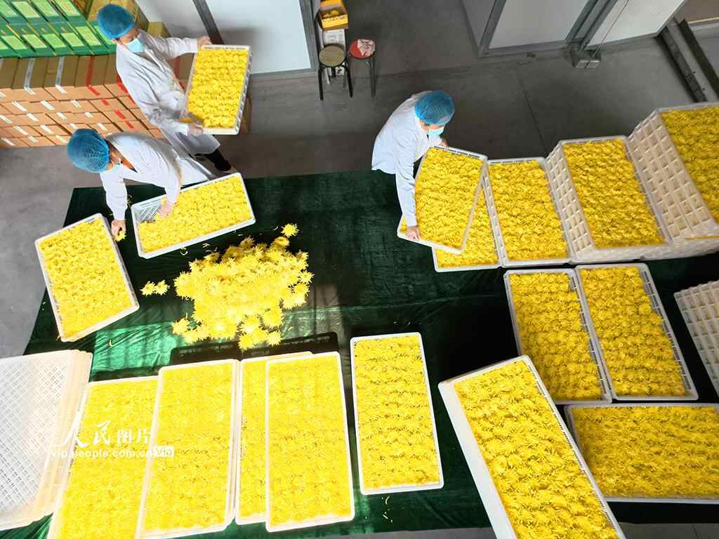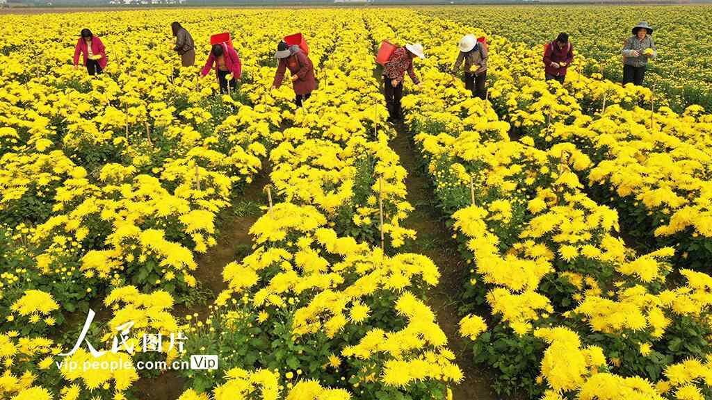 金秋时节,河南省鄢陵县张桥镇裴庄村种植的菊花陆续进入采摘期。农民们忙着收获、加工菊花,田间、车间一派繁忙景象。牛书培摄(人民图片网)