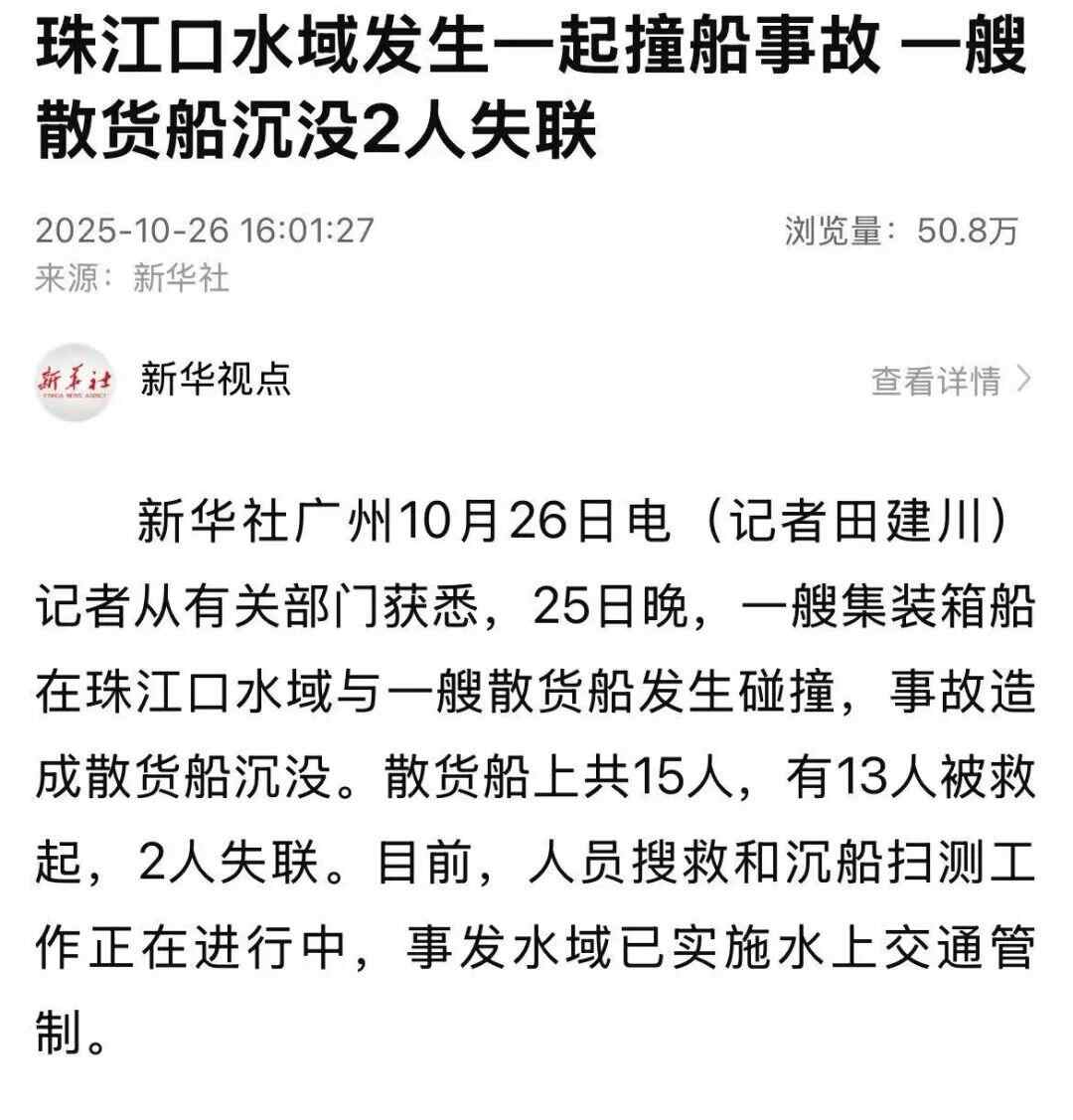 记者从有关部门获悉,25日晚,一艘集装箱船在珠江口水域与一艘散货船发生碰撞,事故造成散货船沉没。散货船上共15人,有13人被救起,2人失联。目前,人员搜救和沉船扫测工作正在进行中,事发水域已实施水上交通管制。