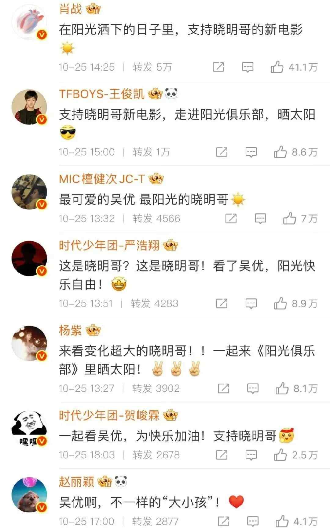 10月25日,著名演员黄晓明的电影新作《阳光俱乐部》全国公映,他在社交账号发文邀请观众捧场,随后,肖战、赵丽颖、周冬雨、杨紫、王俊凯、檀健次、贾乃亮、陈赫、蒋欣、岳云鹏、张天爱等圈中好友都积极为他打call,尽显黄晓明的好人缘。