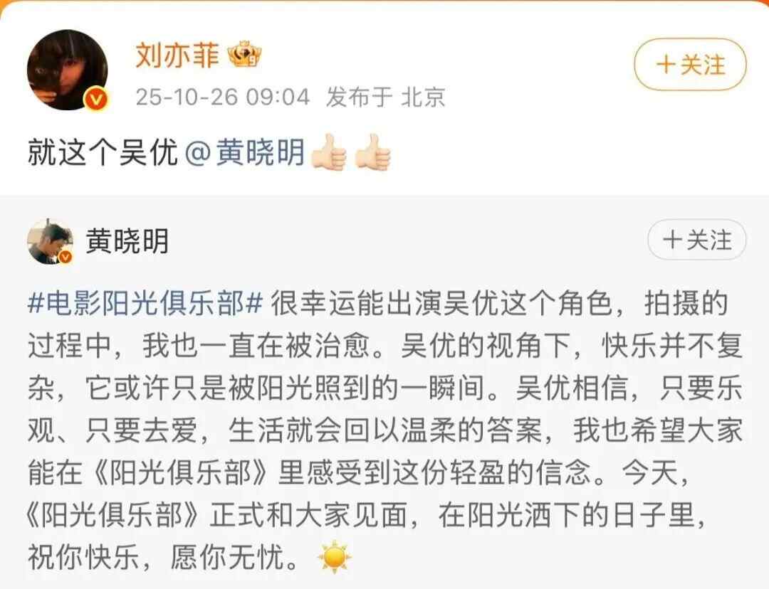 10月26日上午,黄晓明的老搭档刘亦菲也在社交账号发了两个“大拇指”,支持黄晓明新片:“就这个吴优@黄晓明。”