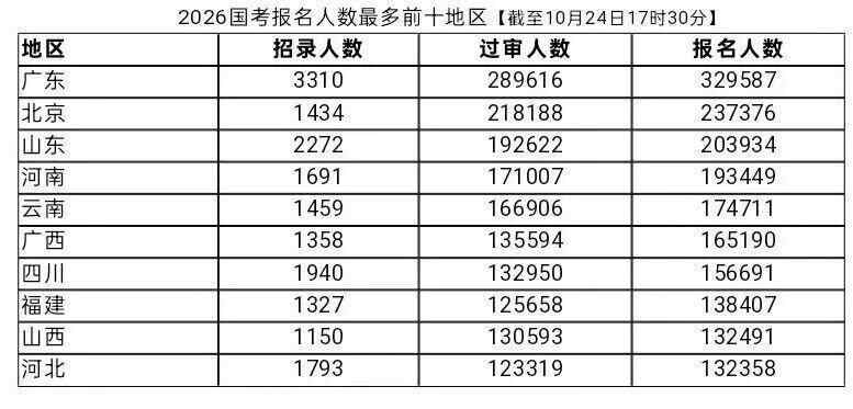 从2026国考各地报名情况来看,位于广东省的国考职位报名人数持续“霸榜”,同时首都北京的竞争指数也持续领先全国。截至10月24日17时30分,广东地区职位报名人数高达329587人,是唯一一个报名人数超30万的地区,以绝对性优势占据榜首之位。首都北京以165.53:1的竞争比占据榜首。