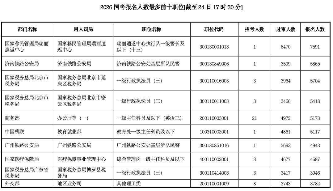 而今年的“扎堆效应”弱于往年,并未出现火热的“万里挑一”。截至24日17时30分,最热岗位为国家移民管理局瑞丽遣返中心的“瑞丽遣返中心执行队一级警长及以下(十三)”,招录1人,报名人数7591人,过审人数6470人。岗位介绍显示,该岗位属于“西部地区和艰苦边远地区职位”,要求应届生,专业要求为“教育学类”,学历要求为“仅限本科”,无基层工作年限要求,限女性报考。(注:公考中部分岗位招录时会分成两个,一个仅限男性报考,一个仅限女性报考)