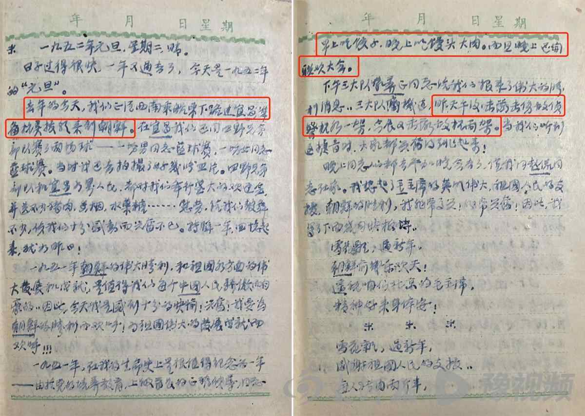 1月1日他写道:旧的思想意识,随时都在袭击着我,刚转到朝鲜听到炮声的偷生保命思想,遇到艰苦发生回祖国思想……这些缺点我有信心在今年坚决彻底把它改掉。