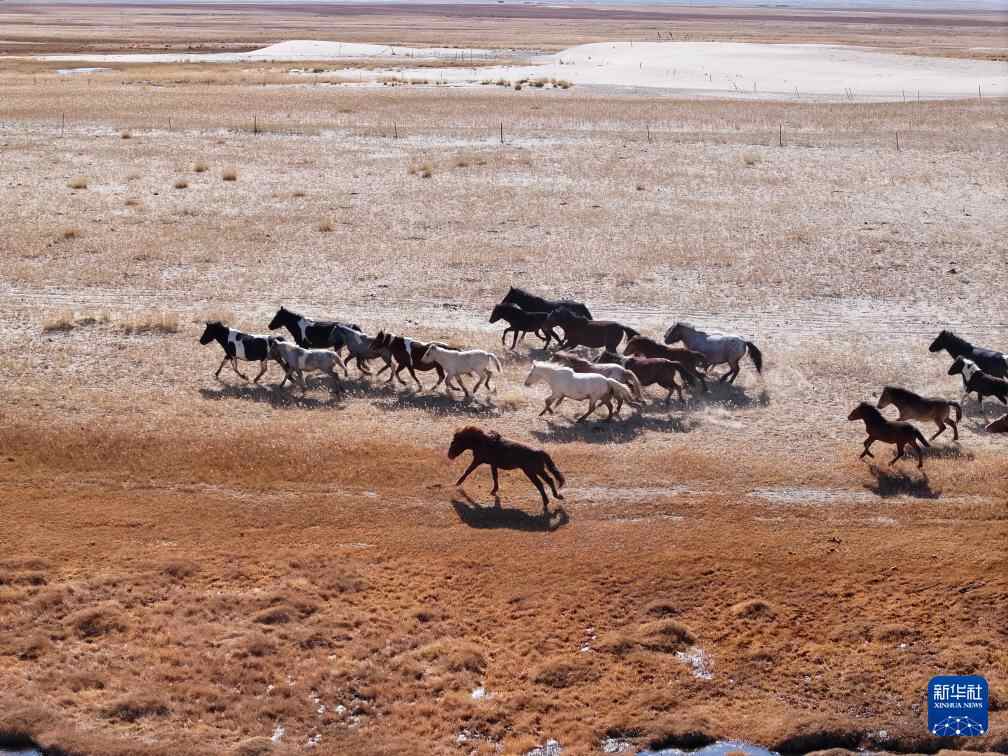 10月23日,甘肃省阿克塞哈萨克族自治县阿勒腾乡哈尔腾高原的马群驰骋在金色草原上(无人机照片)。
