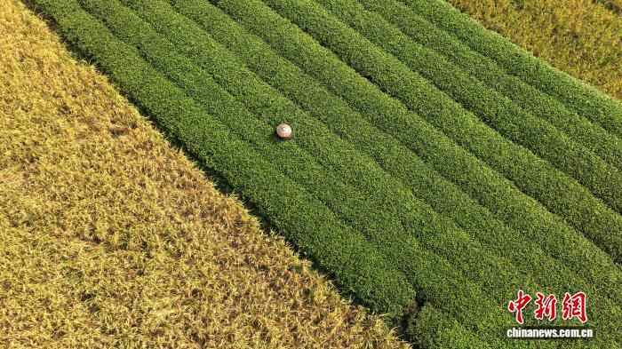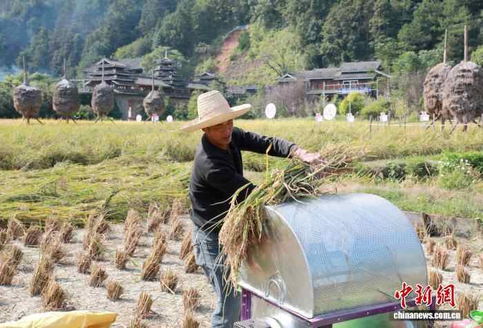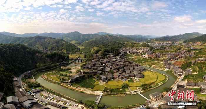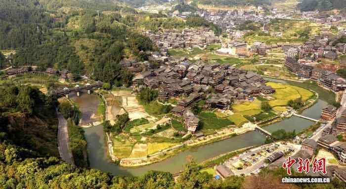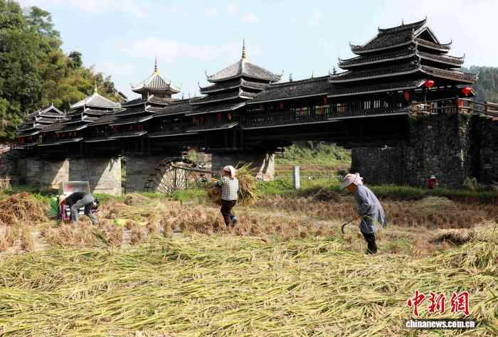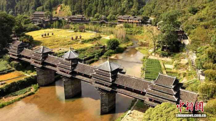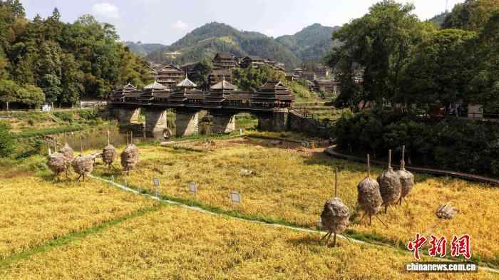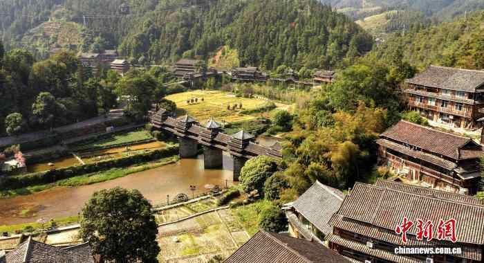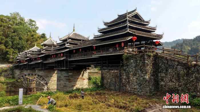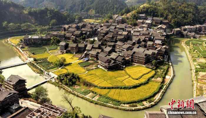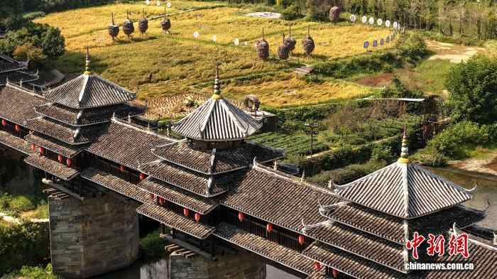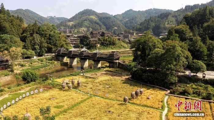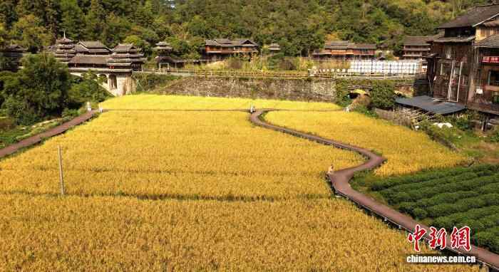 10月24日,在广西三江侗族自治县林溪镇程阳八寨景区,金黄稻田、古朴侗寨、蜿蜒河水与村民田间劳作的忙碌身影相映成趣,绘就一幅诗意盎然的金秋画卷。图为程阳八寨秋景。龚普康 摄