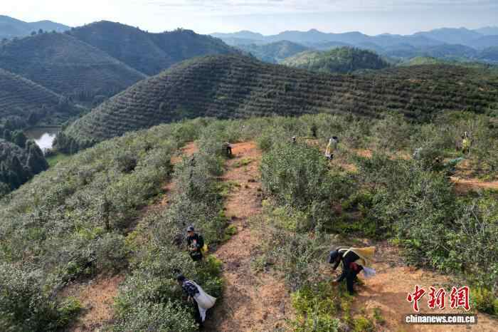 10月24日,广东省河源市龙川县穗丰油茶产业种植基地的工人在采摘油茶果。近日,广东省油茶鲜果迎来采摘高峰期,河源市作为广东省油茶核心产区,拥有逾千年油茶种植历史。(无人机照片)中新社记者 陈楚红 摄