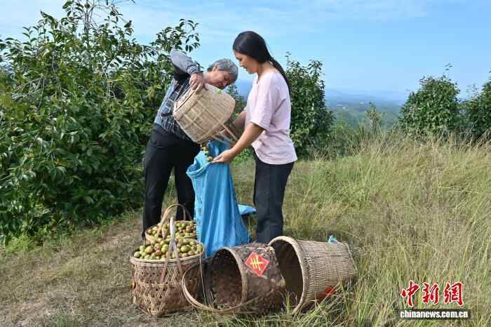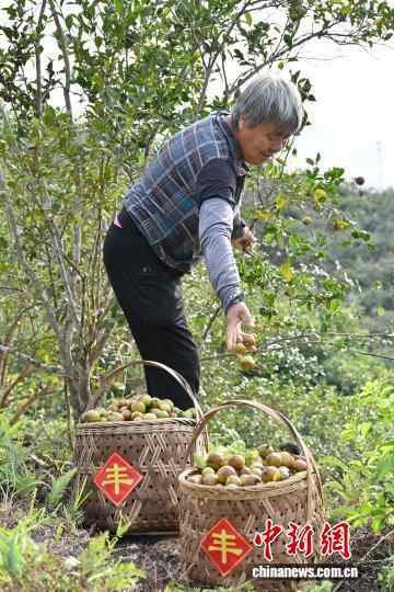 10月24日,广东省河源市龙川县穗丰油茶产业种植基地的工人将采摘的油茶果装袋。近日,广东省油茶鲜果迎来采摘高峰期,河源市作为广东省油茶核心产区,拥有逾千年油茶种植历史。中新社记者 陈楚红 摄