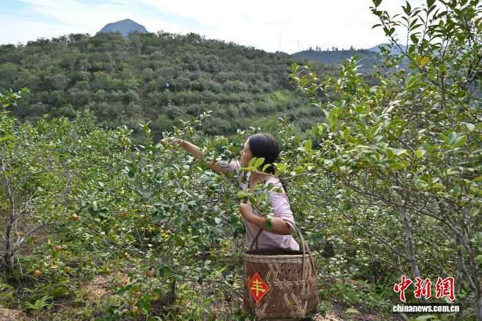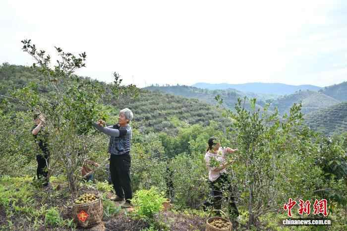 10月24日,广东省河源市龙川县穗丰油茶产业种植基地的工人在采摘油茶果。近日,广东省油茶鲜果迎来采摘高峰期,河源市作为广东省油茶核心产区,拥有逾千年油茶种植历史。中新社记者 陈楚红 摄