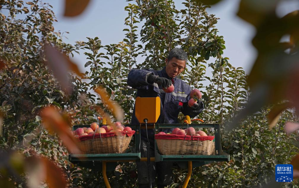10月23日,在新疆生产建设兵团第一师阿拉尔市六团三连苹果园,林果业服务队队员采摘苹果。