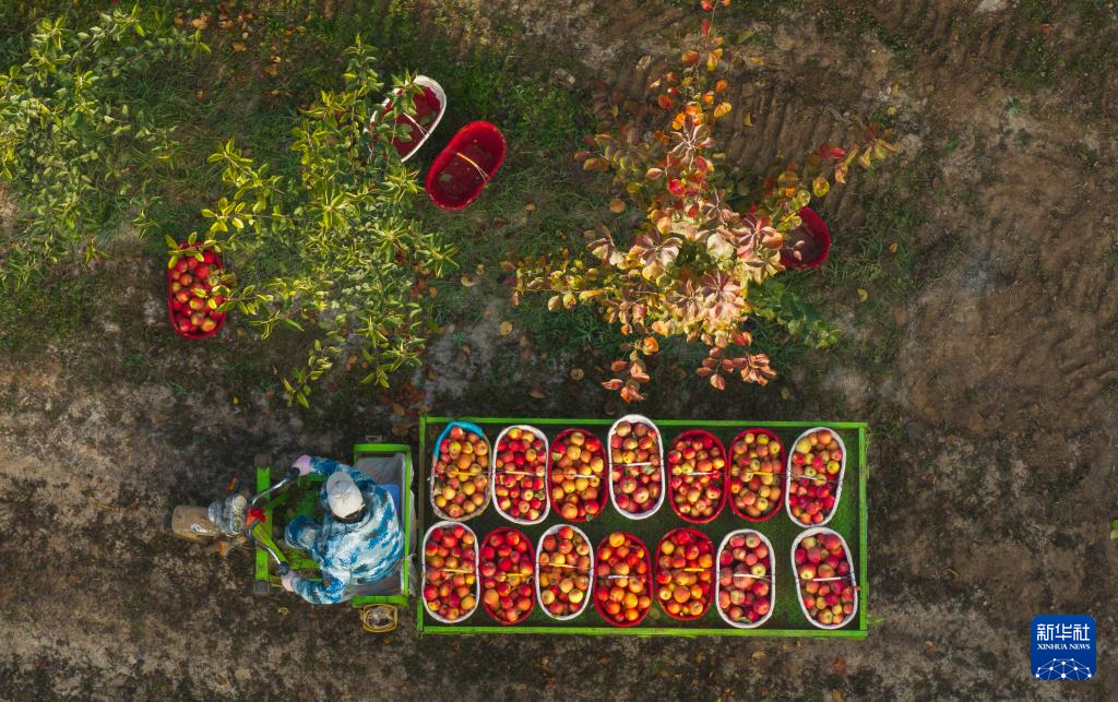 10月23日,在新疆生产建设兵团第一师阿拉尔市六团三连苹果园,林果业服务队队员运输刚采摘的苹果(无人机照片)。
