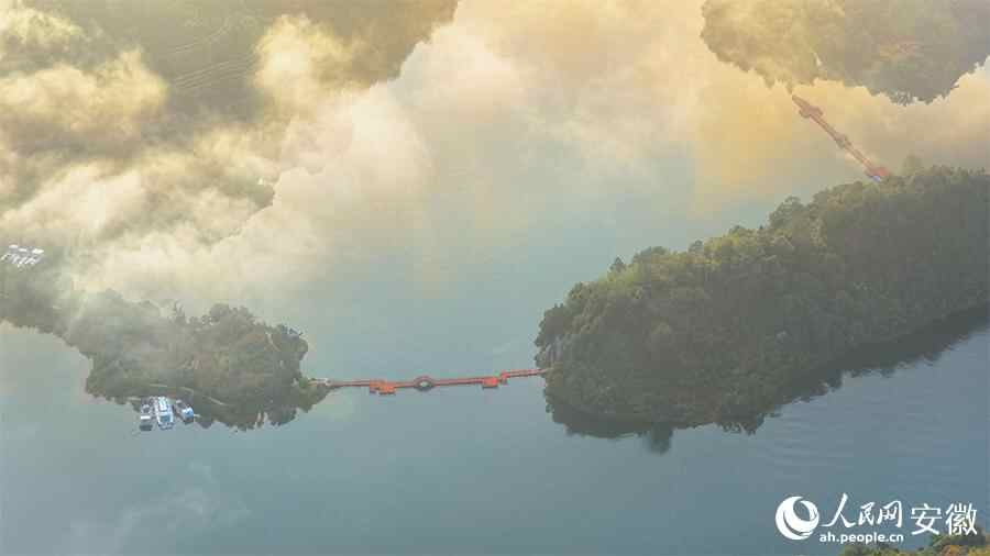 清晨时分,丰乐湖云雾缭绕,美不胜收。人民网 郭昊摄
