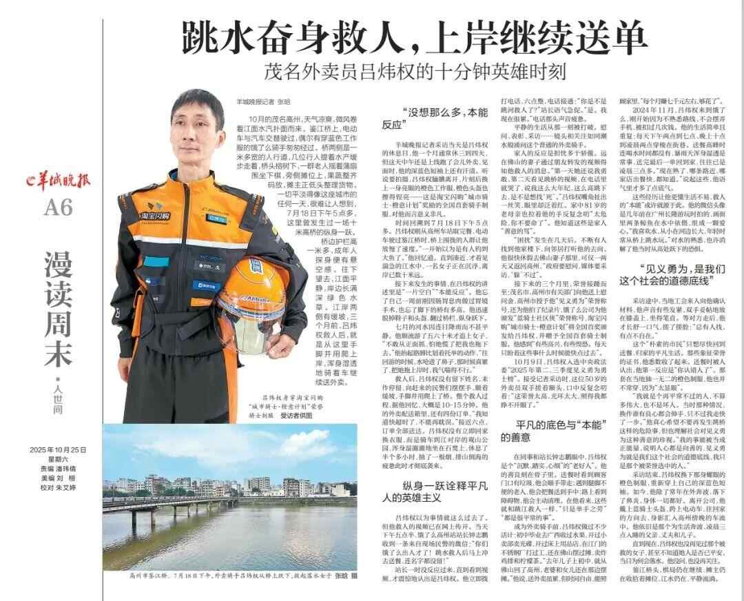在同事和站长钟志鹏眼中,吕炜权是个“沉默、踏实、心细”的“老好人”。他的善良刻在骨子里。送餐时看到顾客门口有垃圾,他会顺手带走;遇到腿脚不便的老人,他会把餐送到手中;路上看到障碍物,他会主动清理。在他看来,这些就和跳江救人一样,“只是举手之劳”“都是很平常的事”。