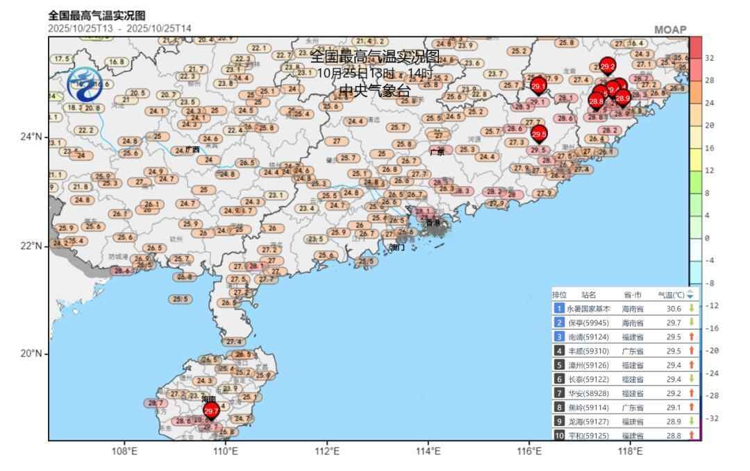 南方尤其是华南地区,今天体感暖和舒服,像广东、海南、福建等多地午后甚至还有热意,14时多地气温直冲30℃。其中,广东深圳已官宣入秋成功,是当地1998年以来最早到来的秋天。