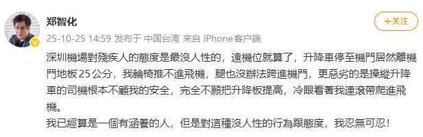 10月25日,歌手@郑智化 在微博发文控诉称,深圳机场对残疾人的态度没人性,升降车离机门地板25公分,他的轮椅推不进飞机,腿也跨不进机舱门,操纵升降车的司机完全不愿把升降板提高,冷眼看着他连滚带爬进飞机。