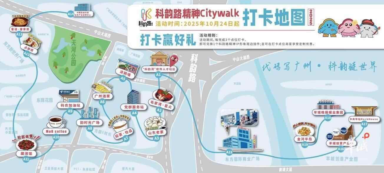 线路从科韵湾软件人才社区出发,贯穿东方新世界广场、中国联通华南信息产业运营中心、羊城创意产业园、东方国际商业广场,全程约4公里,共设置19个特色打卡点位。