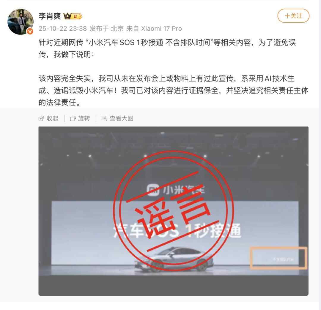 10月22日晚,小米汽车副总裁李肖爽就网传“小米汽车SOS 1秒接通不含排队时间”等内容发布声明辟谣。