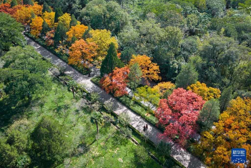10月23日,游客在江苏南京明孝陵景区石象路观赏秋景(无人机照片)。