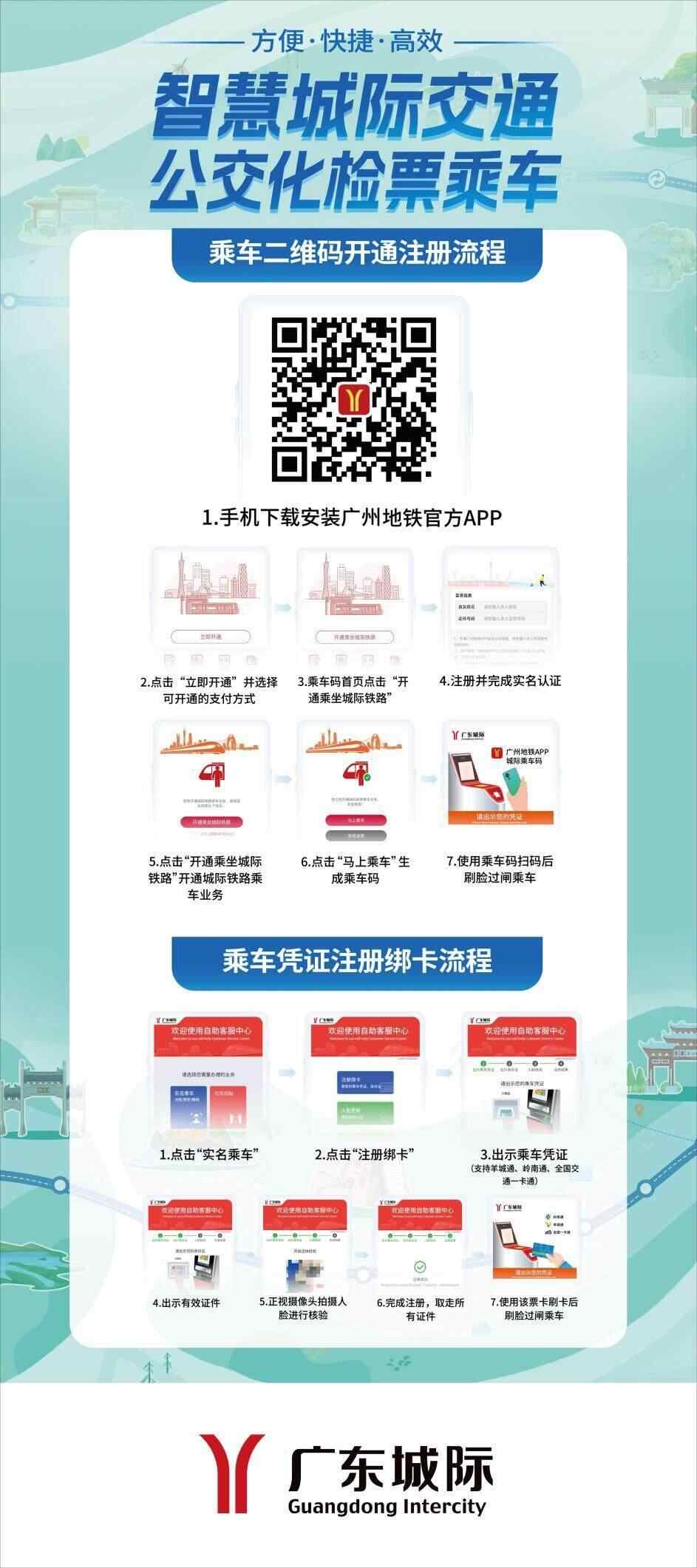 旅客首次使用城际铁路公交化多元支付票务系统需提前完成实名注册,可选择在广州地铁APP上通过实名认证后使用城际乘车码经红色闸机核验人脸后进站乘车及出站;也可以前往广惠、广肇、广清、广州东环和琶莲城际铁路任一车站的自助客服中心,凭本人居民身份证(年满14周岁)通过实名制验证后绑定实体票卡后通过红色闸机核验人脸后进站乘车及出站。
