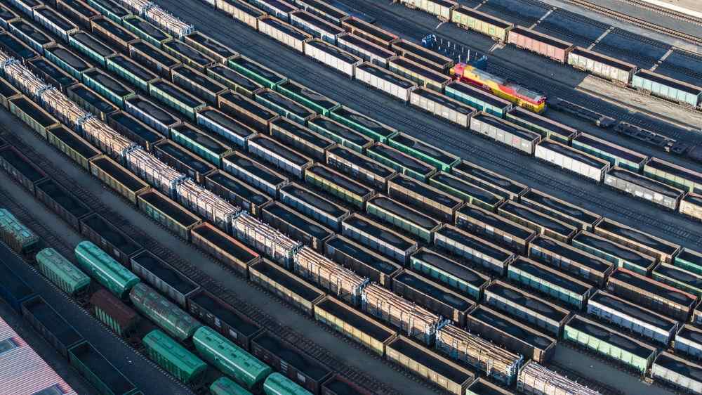 2025年10月18日,在中国铁路哈尔滨局集团有限公司绥芬河站南场,满载进口货物的列车等待解体换装(无人机照片)。新华社发(曲艺伟 摄)