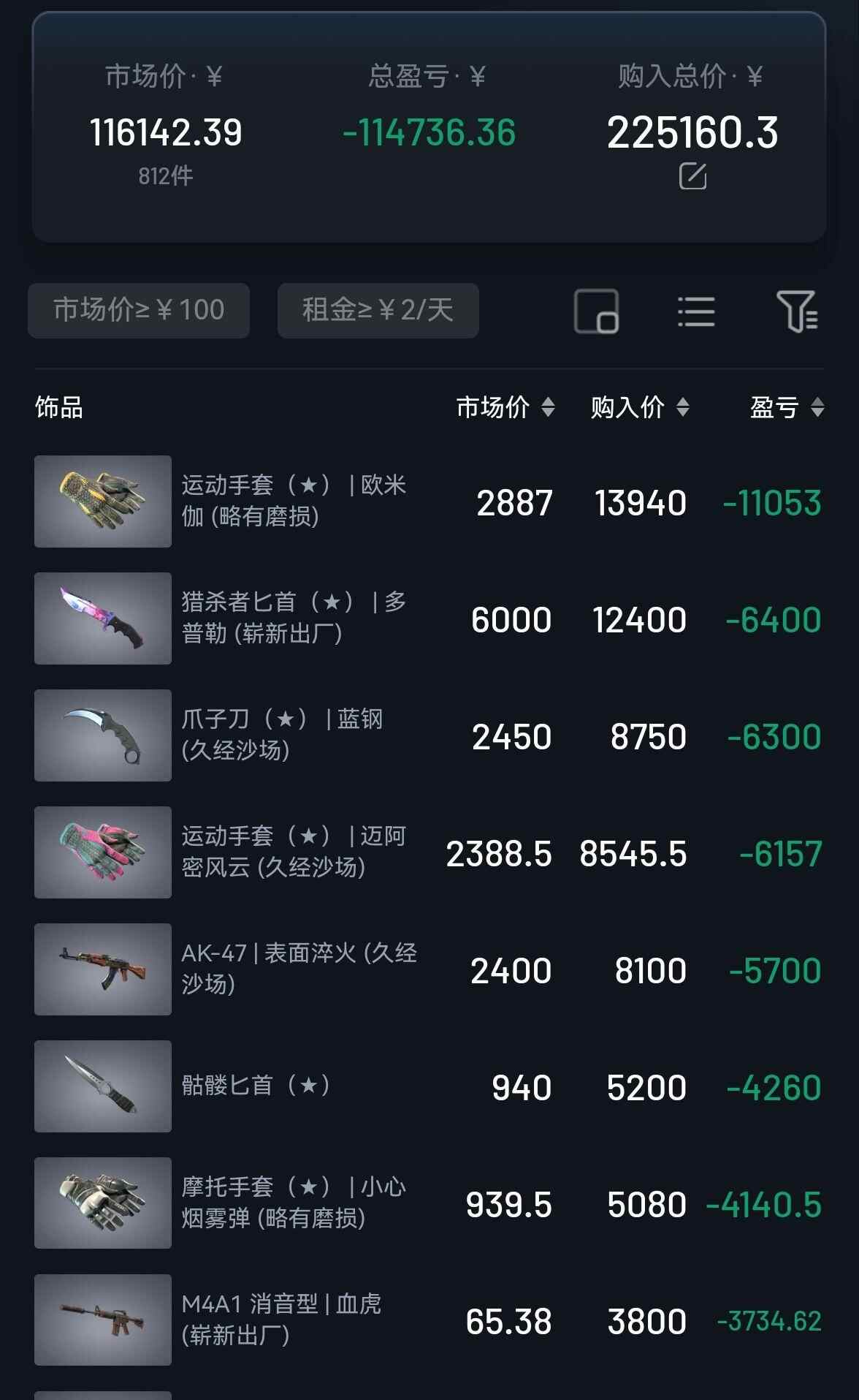 一位网名为“twistzz木”,主要从事饰品租赁业务的《CS2》游戏玩家告诉羊城晚报全媒体记者,自己累计在市场投入超22万元,在本次市场崩盘中,两天已亏损超11万元。他表示,由于金色饰品二级市场购价较高,不少玩家选择以租赁形式体验,在各大交易平台都形成了具有一定规模的租赁市场,不少资金充裕但偏向于低风险投资的玩家会选择购入金色饰品后放租,每年可获得5%-15%左右的租金回报。而由于放租的饰品大多是此次更新直接冲击的金色饰品,此类玩家也成为最先受到冲击的玩家群体之一。多位玩家向记者表示,以蝴蝶刀、M9刺刀等为代表的部分近战武器类饰品在二级市场的价格已回到2021年水平。