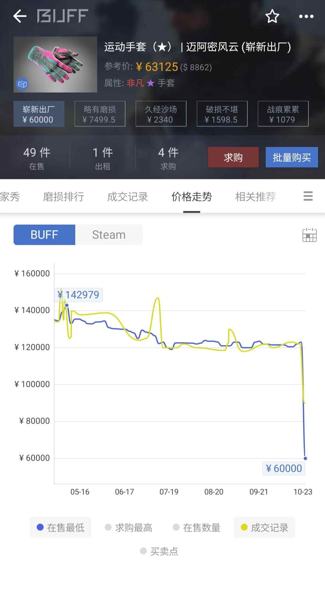 以某款2018年加入游戏中的粉色系手套为例,该款名为“运动手套|迈阿密风云”的饰品在二级市场价格最高一度达到14万元以上。23日更新后,由于可通过下级饰品合成获得,不再具有稀缺性,同款饰品价格暴跌,截至24日下午2时35分,该款饰品价格在交易平台挂牌的最低价格为55000元。