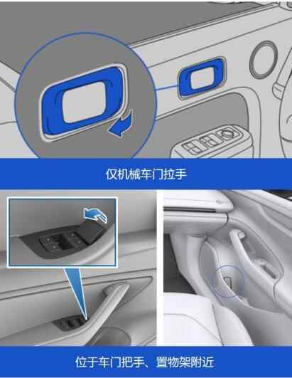 优先选择车门逃生,电子锁失效时,车内人员可使用机械解锁装置开门逃生。配备电子锁的车门内机械解锁装置一般位于车门把手、车门置物架附近等位置。