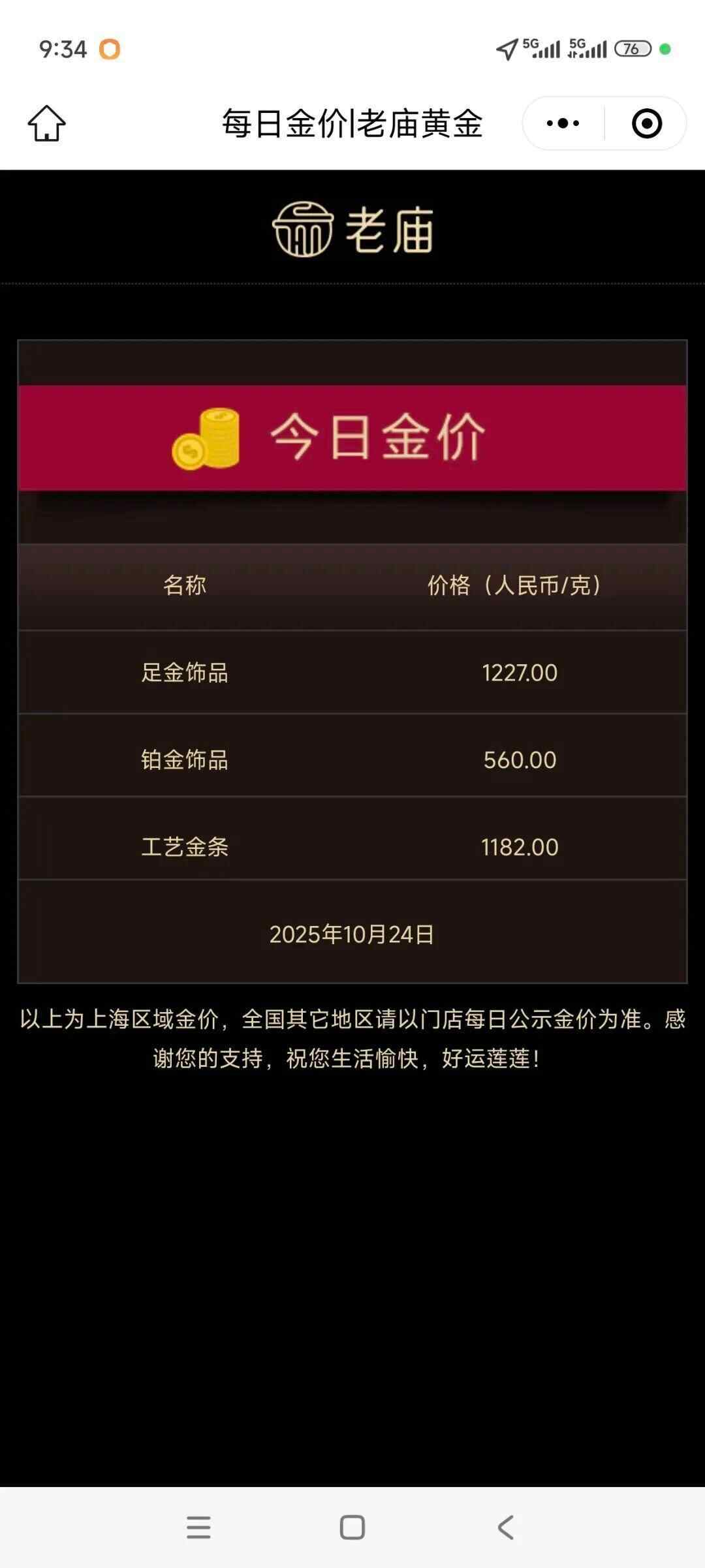 受此影响,10月24日,周生生足金饰品报价1236元/克,较昨日调整后报价1211元/克上涨25元/克;老庙黄金足金饰品报价1227元/克,较昨日调整后报价1213元/克上涨14元/克。